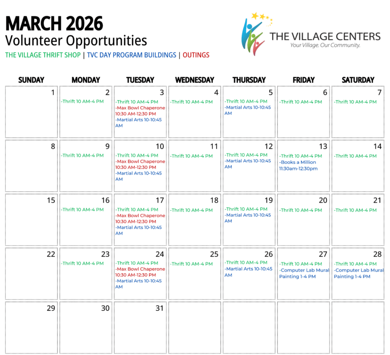 Please complete the online Volunteer Waiver Form below. Once submitted, you will be redirected to Step 2 to complete your Volunteer Online Account AND view a quick Volunteer Training Guide – a separate form must be completed for each individual volunteer. Thank you for your desire to volunteer at The Village Centers or The Village Thrift Shop!